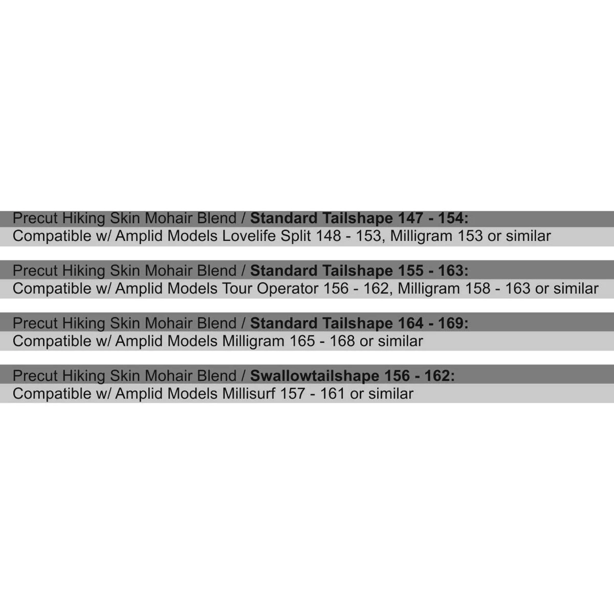 - Precut Hiking Skin Mohair Blend / Standard Tailshape 155 – 163 Compatible w/ Amplid Models Tour Operator 156 – 162, Milligram 158 – 163 or similar (w/ Butterfly clips)