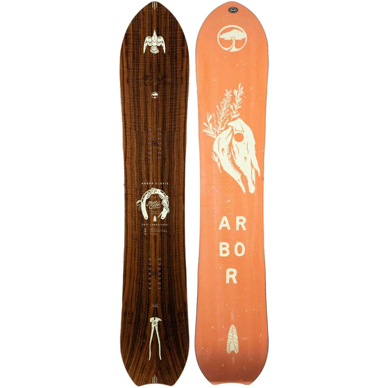 The Clovis is Arbor’s latest System Camber gun. Arbor designed the Clovis with pro team rider Mark Carter, who drew shaping inspiration from Native American arrowheads to deliver the performance, power, and stability required for hunting massive mountain lines. This board has volume in the nose, increased overall width, added taper, and a shorter tail length for maximum float. Increased snap and torsional rebound increase control in critical situations thanks to four Carbon A-Frames that run diagonally towards the center of the board from the outside contact points. A high performance board with environmentally conscious construction.