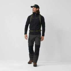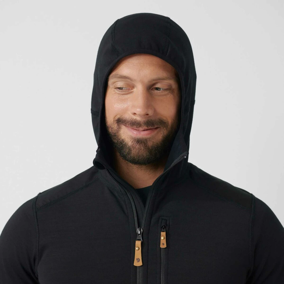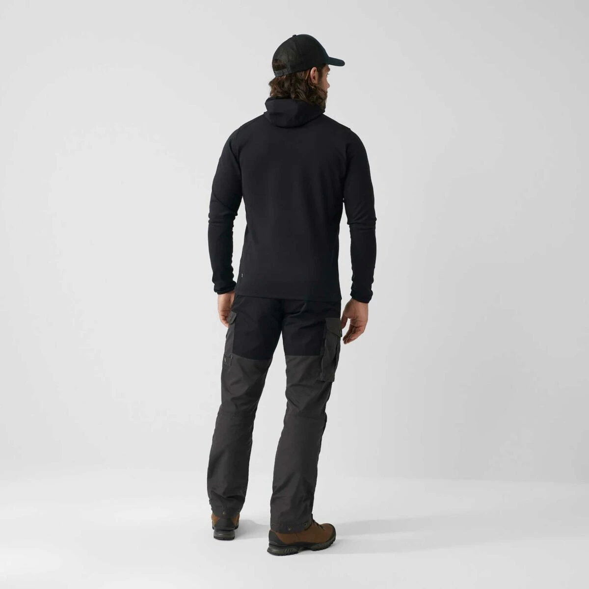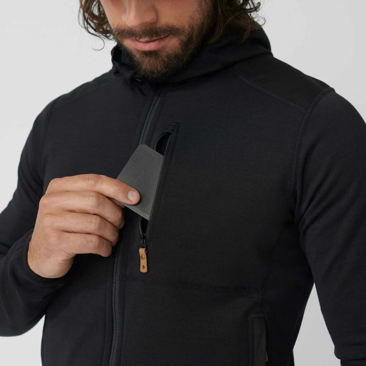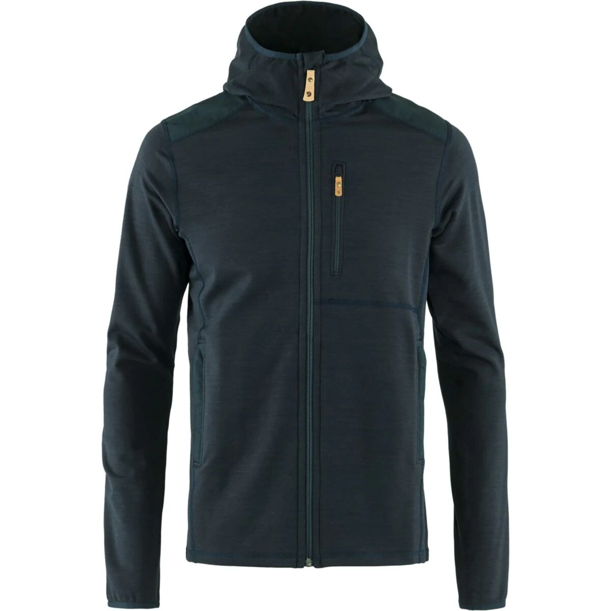 Fjallraven Keb Fleece Hoodie voor heren is van een functionele wolmix gemaakt. De vlak gebreide, wrijvingsarme buitenkant glijdt gemakkelijk onder een shelljack, terwijl de zachte structuur van de binnenkant verwarmt en vocht afvoert. Een veelzijdige en comfortabele midlayer die net zo geschikt is in de zomerse bergen als voor het skiën in de winter. Functioneel fleece dat verwarmt en vocht afvoert. Versterkingen in G-1000 Eco op de schouders. Twee handzakken met rits. Verticale borstzak met rits. Goed aansluitende capuchon. Voorrits met kinbeschermer. Gladde buitenkant, geborstelde binnenkant. Polyester (deels gerecycled), wol en elastaan. Elastische randen rond capuchon, manchetten en zoom.