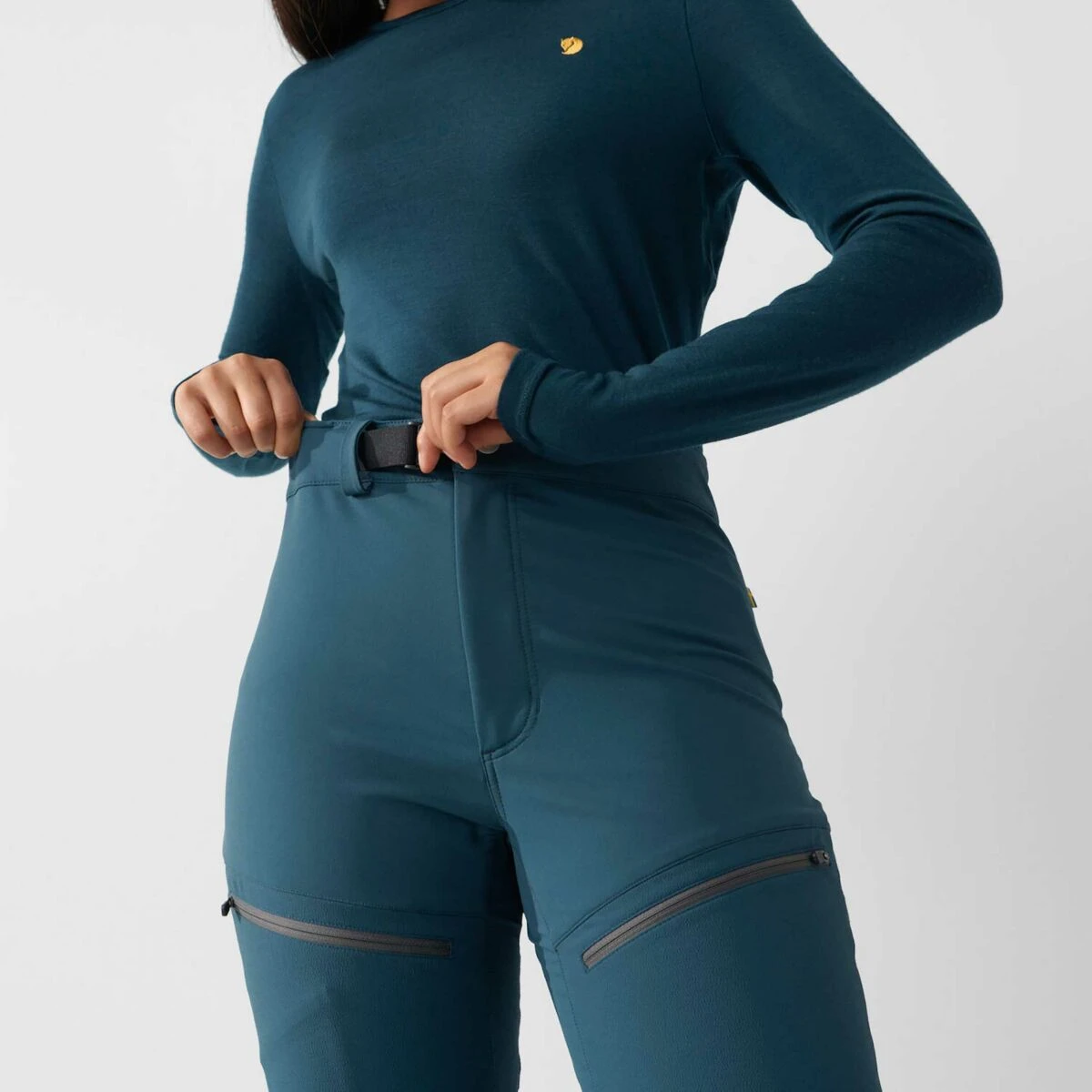 De FjallRaven Bergtagen Touring broek voor Dames is een technische stretchbroek voor tourskiën en alpinisme die je van de herfst tot het begin van de lente kunt dragen. Dit hybride design combineert drie verschillende stretchmaterialen voor de perfecte balans tussen ventilatie, beweging en bescherming. Ritsen over het bovenbeen zodat overtollige warmte weg kan. Verstevigde sluitingen onderaan de pijpen. De voorgevormde pasvorm biedt optimale bewegingsvrijheid terwijl de geïntegreerde sneeuwvangers je laarzen vrij van sneeuw en vuil houden. Uitgerust met een Recco®-reddingsreflector.